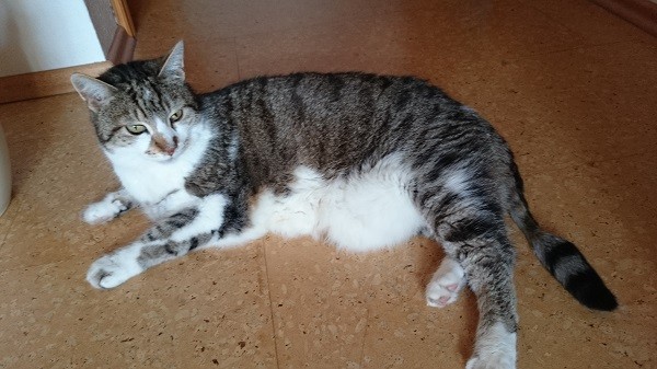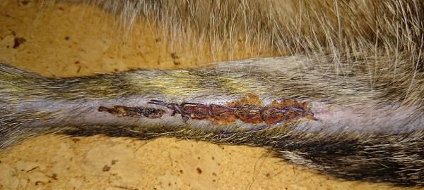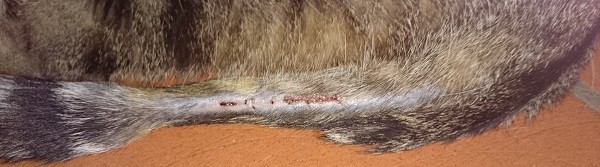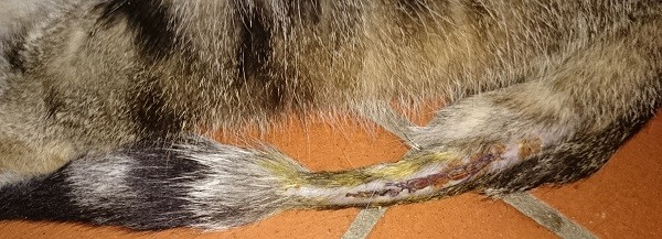 Unsere Katze Jessy hatte einen Unfall. Ein Auto fuhr über ihren Schwanz, der platzte komplett auf.