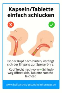 Viele schlucken Tabletten oder Kapseln instinktiv mit zurückgelegtem Kopf – dabei hilft eine leichte Vorneigung deutlich besser. Einfach ausprobieren: Kopf sanft nach vorn, Wasser dazu – und die Tablette oder Kapsel gleitet mühelos.
